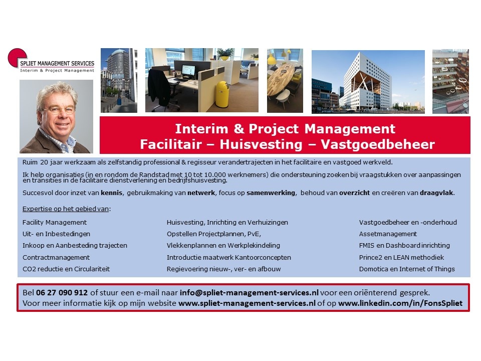 Projectmanager / interim professional en regisseur facilitaire dienstverlening. Specialist op het gebied van huisvesting & inrichting in combinatie met maatwerk oplossingen van Het Nieuwe Werken bij organisaties met 10 tot 10.000 medewerkers.